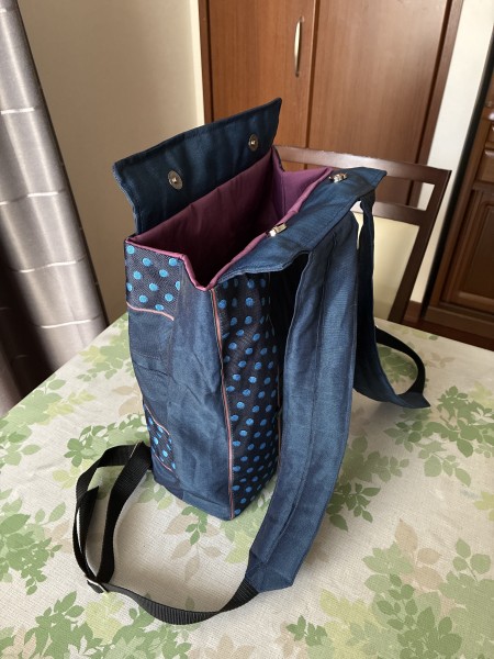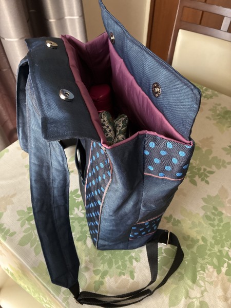 丈夫でとても軽い素材で、水玉のヘリをアクセントに組み合わせをしました。すっきりした形になるように、肩ひもを工夫して取り付けました。