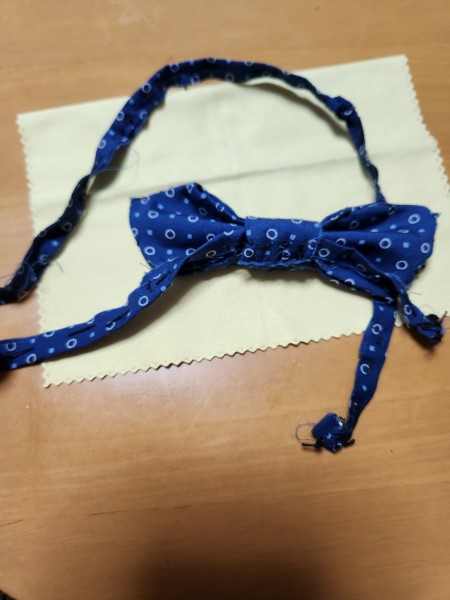ぬのことふぁぶりっくさんのサイトに蝶ネクタイの作り方が載っていたので、作ってみました。ゴムではなく、紐を作ってホックで留めました。