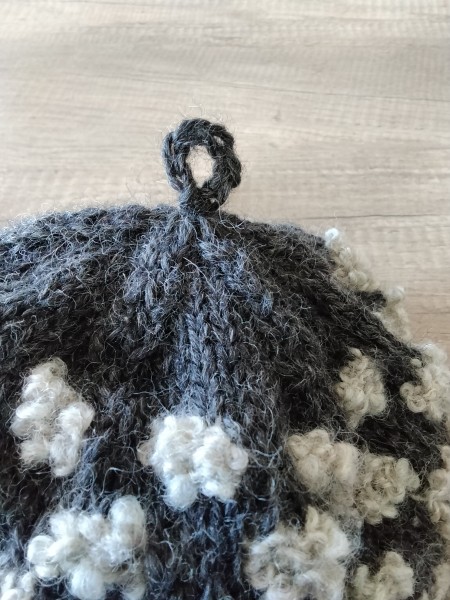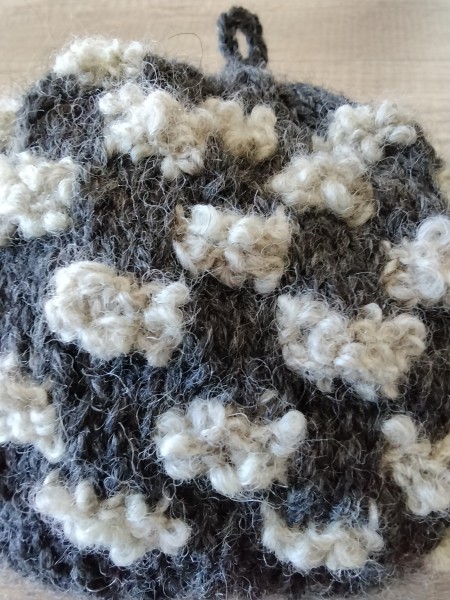 ひつじ糸の残り糸でみずたまに。グレー糸足りず、少し小さく仕上がる。