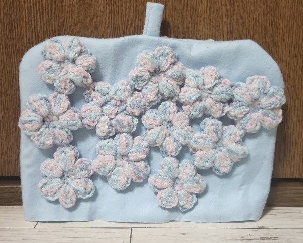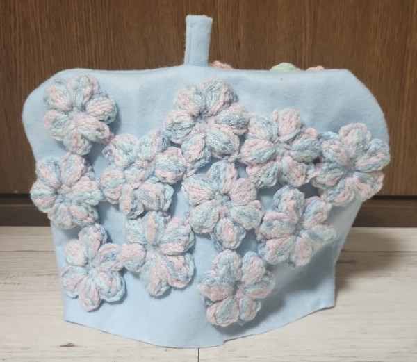 ティーコジー本体はフェルトで作り、外側の花は毛糸で編みました。