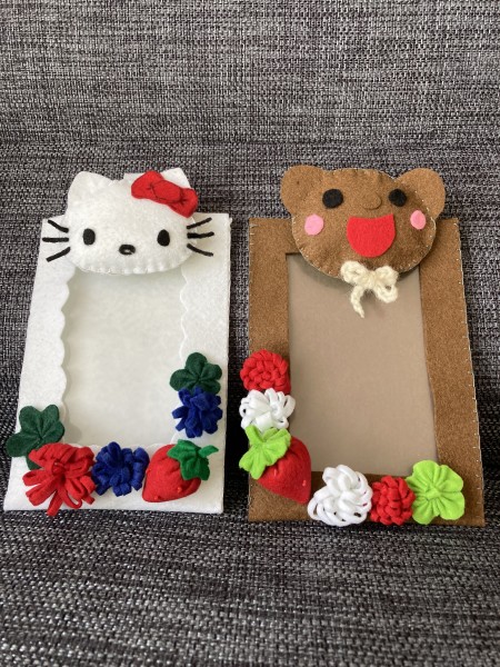 | 会員証や定期券、推し活の写真を入れたり、壁にかけて好きな写真を飾るなど,用途はいろいろです。 使う場所に応じて必要な金具をつけて使います。 子供の手芸練習用の試作品として作りました。 縫う、ボタンつける、マスコットを作るなど、いろいろな練習をしながら楽しんで作品を作ることを目的にしています。 |