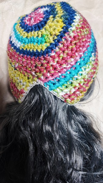 ソックスの余り糸でワンピースを編んだら、帽子もセットにしたくなりました。