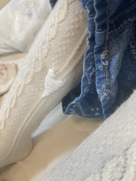 | 小学1年生の娘が、 靴下の側面に 穴を開けてきて!? 気に入っている 長靴下だからと 可愛く刺繍したかったものです。 何も参考にせず、 ただハートに縫ってみました。 完成は、意外と大きくなっちゃったし、 形も縦長になっちゃったけど 娘は「可愛い」と喜んでくれました。 刺繍もっと勉強したいな |