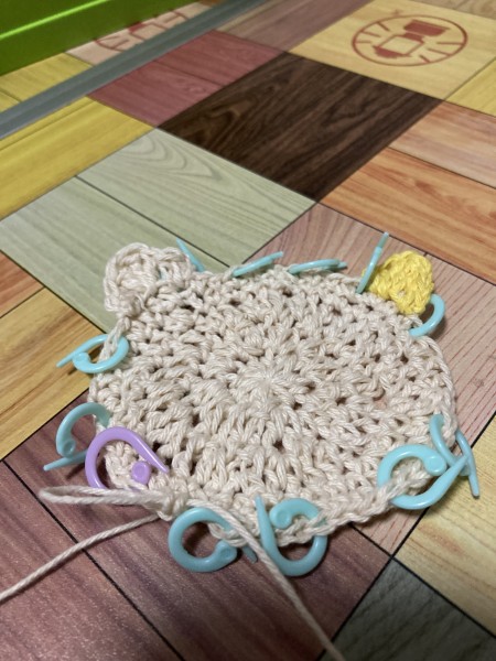 はじめは、きらめきコットンのピンクだけで編み始めようとしたら
