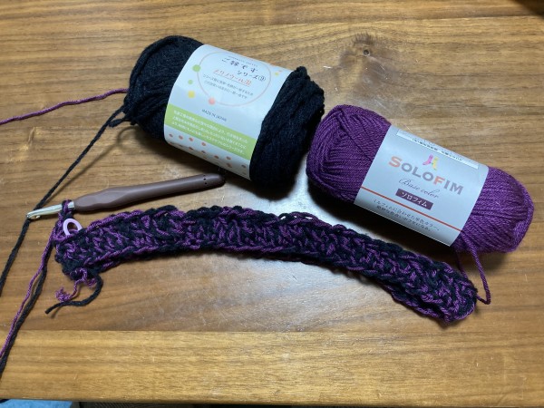 | 使用糸 | Seriaソロフィム パープル、Seriaご縁ですシリーズ⑨ブラック、Seriaルーン パープル、カラフルポンポン 白系 |
