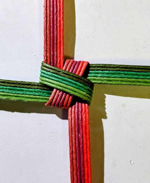 クラフトバンドの余り紐で、四つだたみのキーホルダーを作りました。