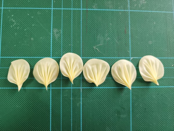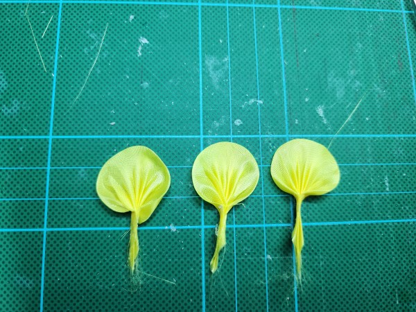 土台…発泡スチロール3㎝球 芯…黒3㎝裏丸つまみ×1枚 ※貼りつけて余計な部分を切り落とす 1列目…黄色5㎝ひだよせつまみ×3枚 ※縁を湿らせてひだをなくす