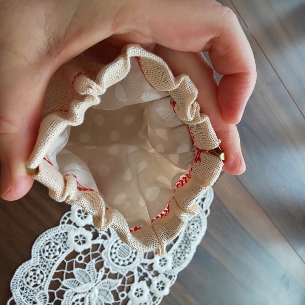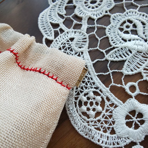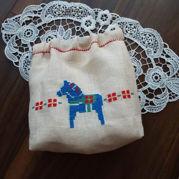 かわいい刺しゅうのキットより。馬好き妹へ。赤い糸のヘムかがりでバネ口を入れる部分を仕上げたのが気に入ってます。
