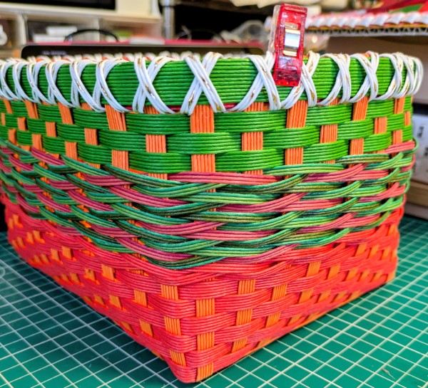 クリスマスカラーで作った大き目のかごです。ビタミンカラーで気分が華やかになります。クリスマスカラーのかごを 眺める事で、気分が前向きになれるように~自然に笑顔になれたらいいですね。