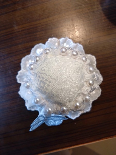 ティーカップ型ピンクッションを作りました。アクセントに蝶々を留まらせました♪