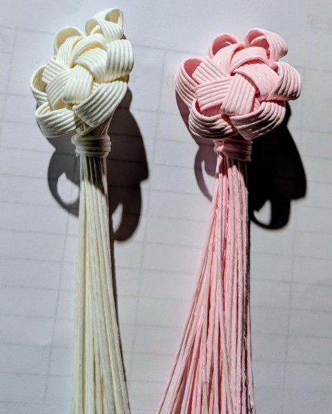 余ったクラフトバンドで、バッグチャームを作りカラフルな花結びを加えました。