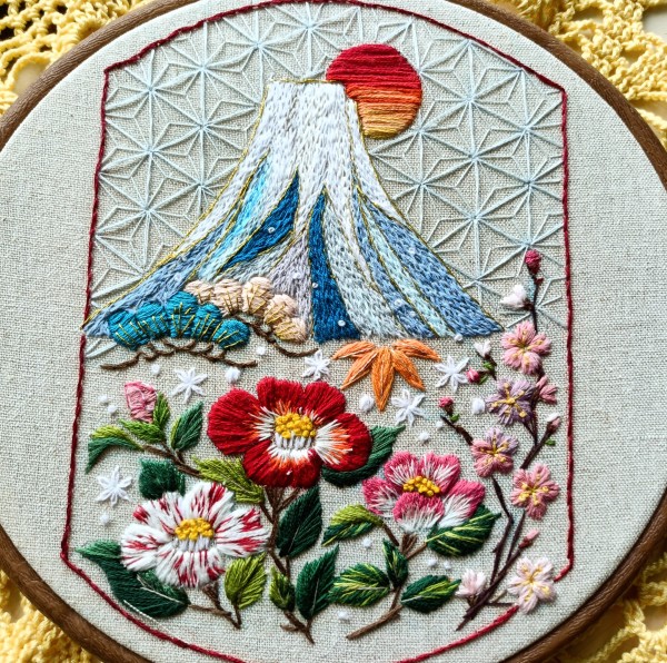 新春らしいモチーフを刺繍しました。