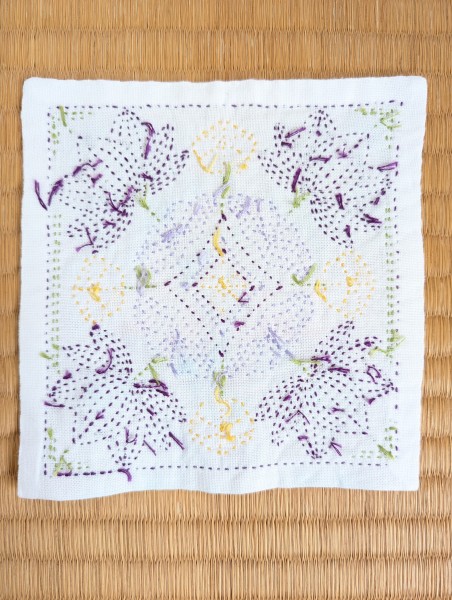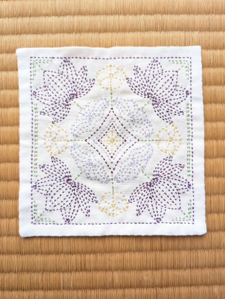 とにかく細かいので、刺し子糸は使わずに、刺繍糸2本取りで刺すことにしました。まずは枠を紫で刺しました。