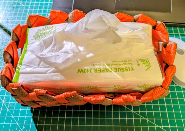 クラフトバンドで 簡単に四つだたみのソフトティッシュケースを 作ったのですが、 全体的に きゅうくつ なってしまったので 1本増やして ゆとりができました。