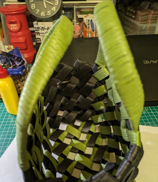 クラフトバンドで、四つだたみの小さいバッグを作りました。その中にはうち袋も入ります。