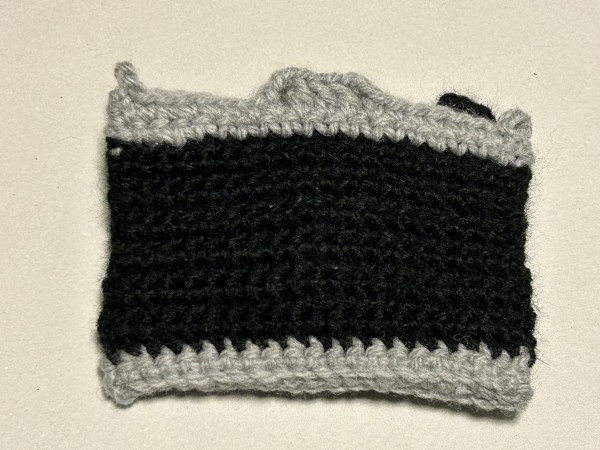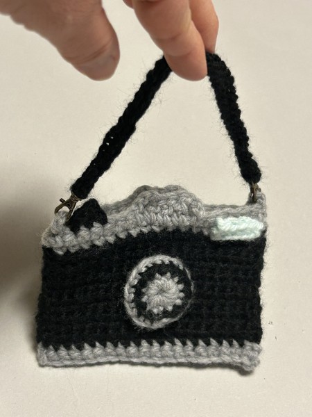 旦那さんの趣味のカメラを編んでみました。目数などのサイズは自分なりに考えて、バランスを見ながら作りました。完成するか不安でしたが、一応カメラに見える作品になったので、満足しています。