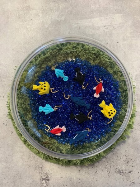 | 可愛い釣り針チャームを見つけたのでつまみ細工でお魚を付けました^_^ | |