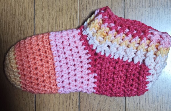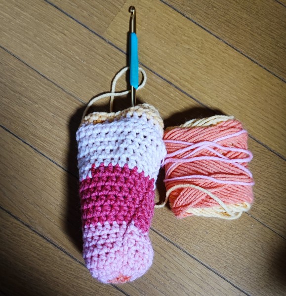 段染めの糸なので、どんな仕上がりになるか楽しみでした。4足目ですが、飽きずに編めてます。