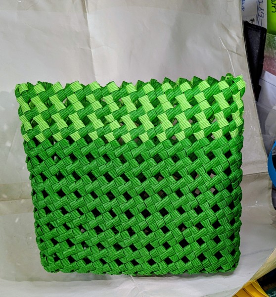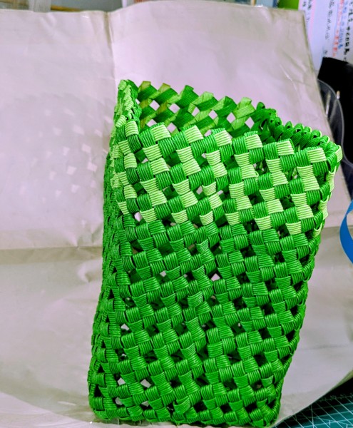 | ・クラフトバンド6本幅でバッグを作ろうと思っていますが、取っ手をどうするか考え中です。 ・本体を手直しすると、四つだたみを水で固めたのでやり直すのが大変だったのですが、2段目までほごして両脇にD管を紐で挟んで編み、ショルダーストラップを付けている。本体の中には、ナイロン製のショッピングバッグを入れている。クラフトバンドの花結びをおまけで付けている |