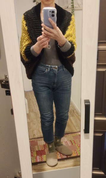 四角編みのゆったりカーディガン2着編みました。私用と母用です。黙々と編み込んで行くだけなのですごく簡単。私用は少し大きめなのでボタンを付けてズレて落ちないようにしました。