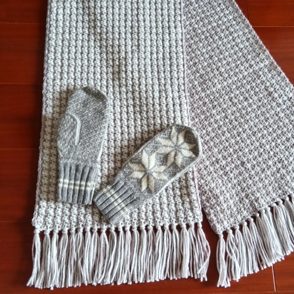 表と裏の表情は違うけど、裏から見ても可愛い。数年前に編んだ手袋に合わせたくて毛糸を選びました。ちょっと色が薄めですが、肌触りも良いし、しっかりしたマフラーになりました。