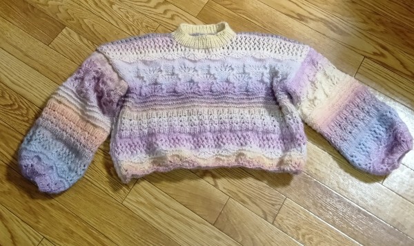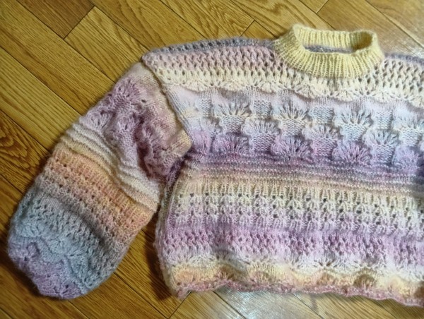 日本ヴォーグ社さん『棒針で編む透かし編みのウェア』より『ミックスセーター』です。