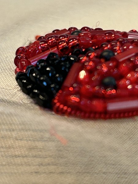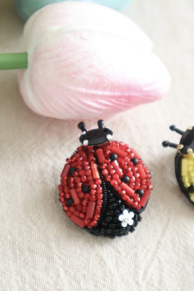 膨らませて刺繍するバルーン刺繍を使ったふっくらてんとう虫。 手足をつけると、虫になりすぎるのであえてつけずに。