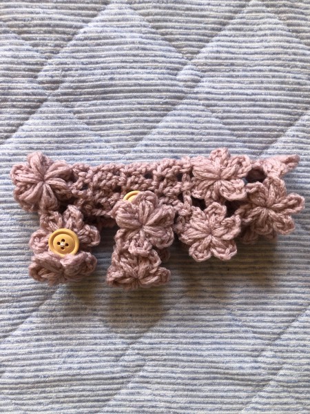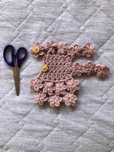 チワワとトイプードルの雑種、女の子です。かなり小さい子でサイズ合わせて編むのが難しいです。首と胸でボタンでとめるポンチョタイプです。