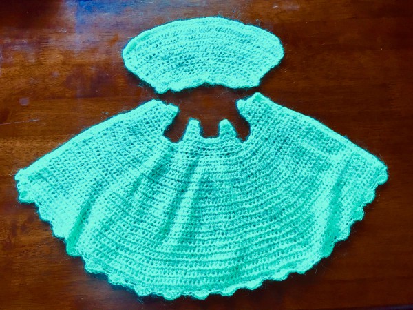 余っていたモヘアの毛糸で、娘のお人形のドレスとリボンの髪飾りを作った。ノースリーブのドレスとお揃いのケープ。