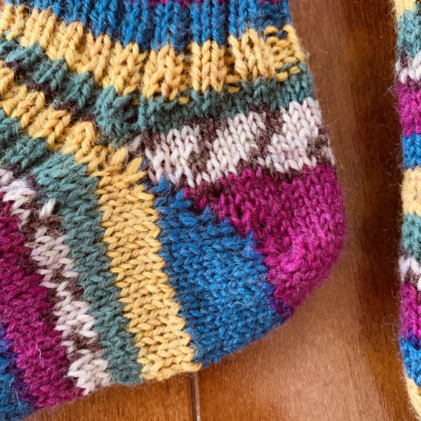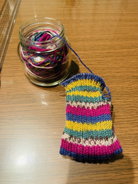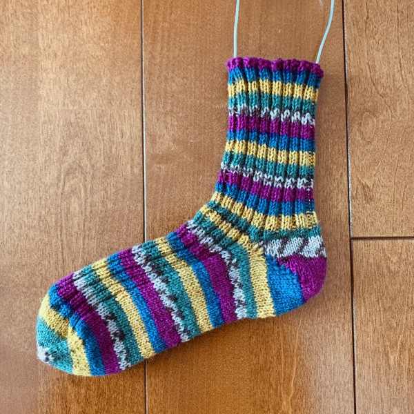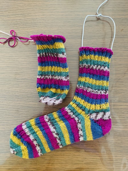 模様編みに挑戦したけど、納得いかずに全部ほどいてからの再挑戦。 無難なリブ編みでかかと終わった所。 片足終わった。可愛い。