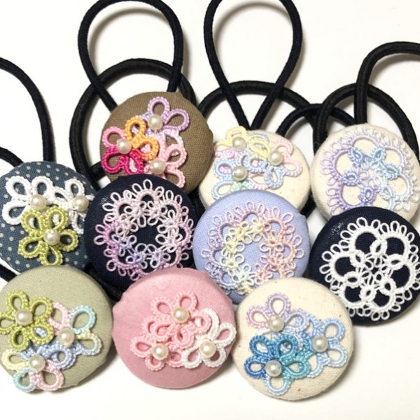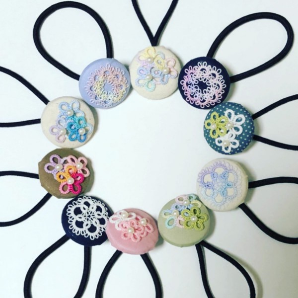 くるみボタンにタティングレースで作った小花やモチーフをつけてヘアゴムを作りました。