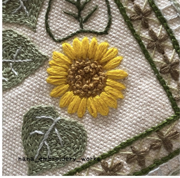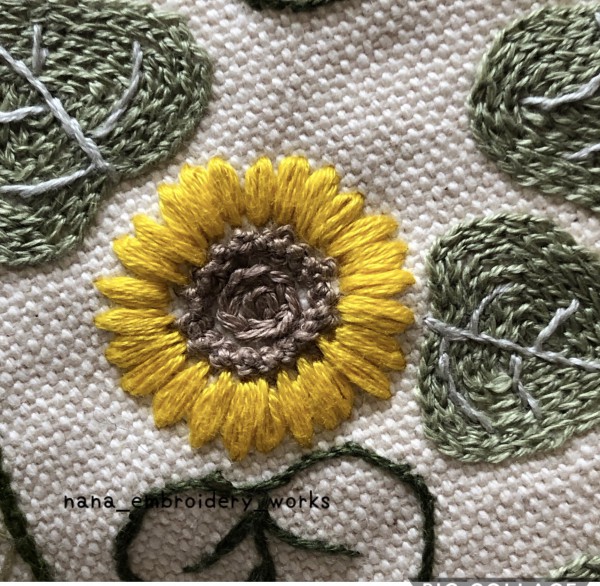 | ひまわりの刺繍を8号帆布に。8号は厚地で刺繍に向いていませんね。。。(指抜きをつけて刺繍しました) ですが さすが小物に仕立てても帆布はしっかり度が↑格段に上です。 | |