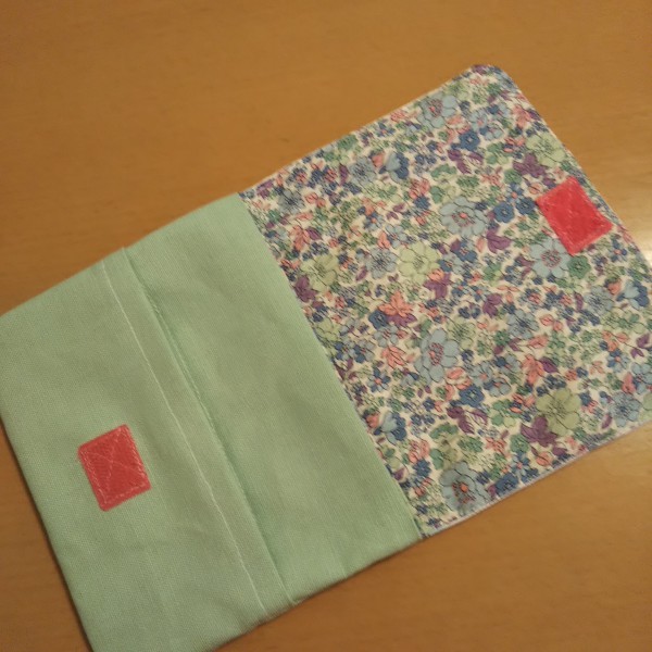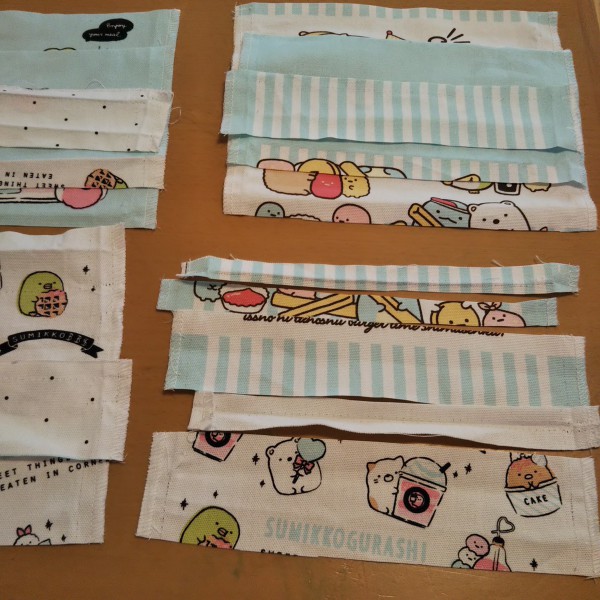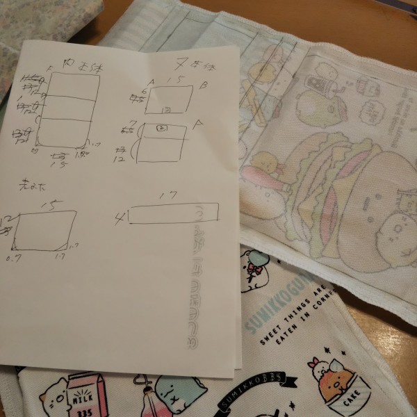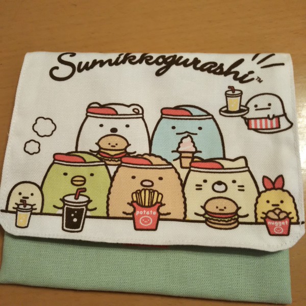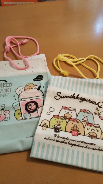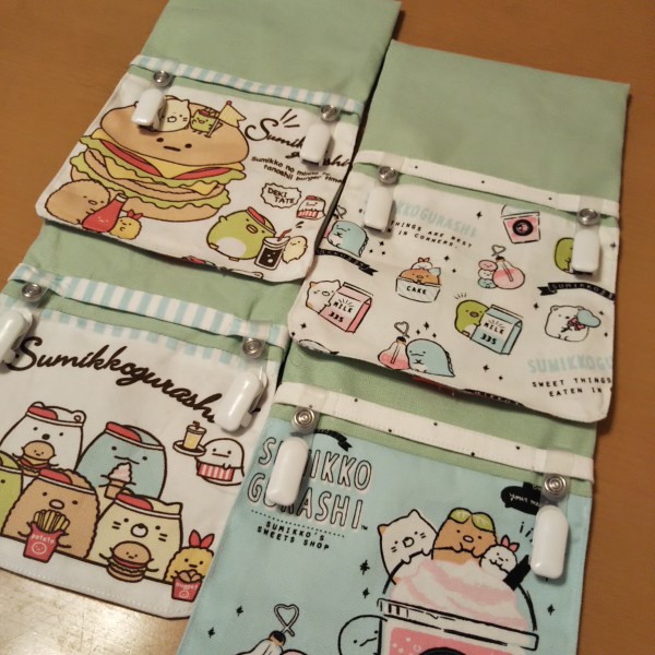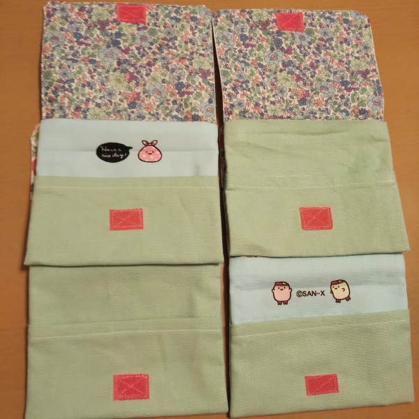 | 娘の大好きなすみっコぐらし。市販の巾着をといて、娘だけの移動ポケットを作製。 本体(黄緑)と裏地(花柄)は家に残っていた生地を使用。 巾着の表裏の柄、底の柄も使いました。 |