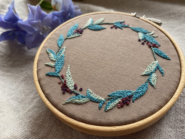 山桃をリースにして刺繍しました。