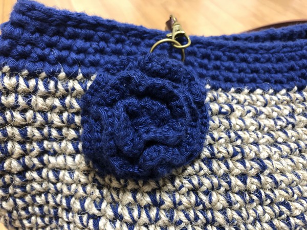 100均の麻紐は、硬くて編みづらいのですが、毛糸を合わせると編みやすくなりました。寂しいので、コサージュを編んでつけました。