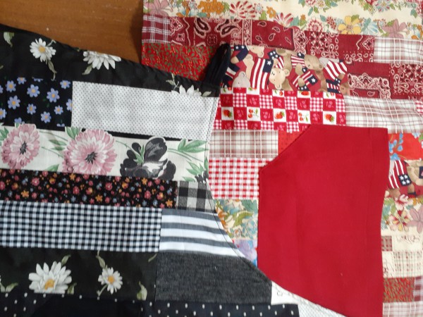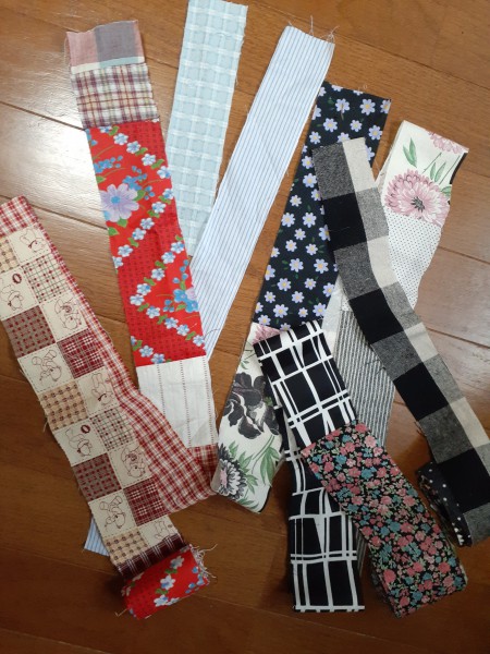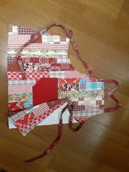 | 家にたくさんあるあまり布をなんとかしたくて作りました。まずロータリーカッターで細くカットした生地をテープ状につなぎます。次に市販のエプロンより少し大きくなるようにつ ぎ合わせ、エプロンの大きさに1cmの縫い代を足した裏布と同じ大きさにカットします。肩ヒモとヒモ通しを中表に合わせた表裏の布の間にはさみこんで周囲を縫い、表に返して返し口を閉じ、端にステッチをかけてポケットをつければ完成です。写真のエプロンはショート丈タイプで丈55cm、左右ヒモ通しの間の幅が72cm、肩ヒモが115cmです。 |