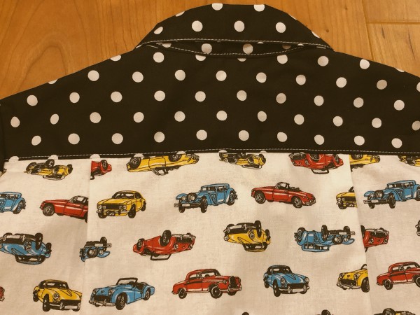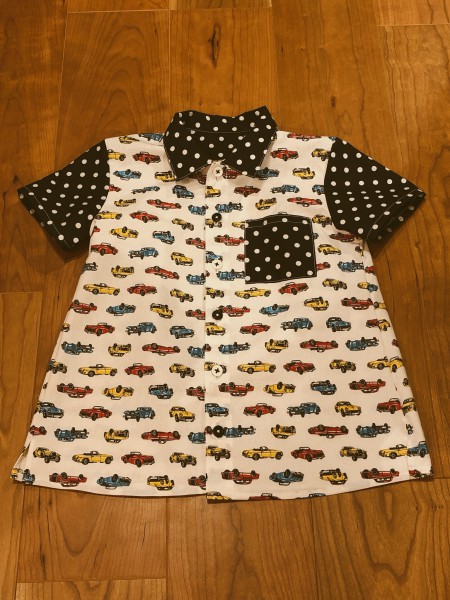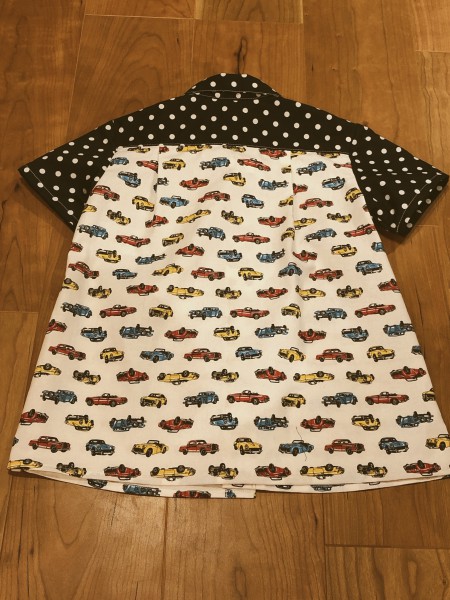 余り生地を寄せ集めて、ちびっこシャツを作りました。思ったより可愛く仕上がりました。