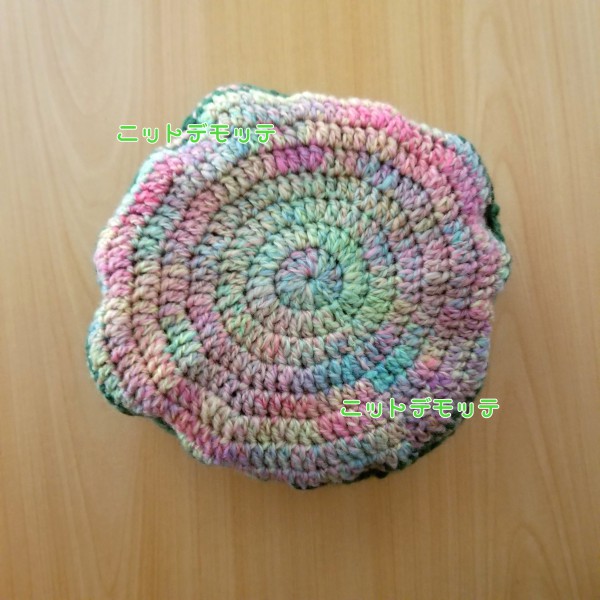 緑色のガーデンフェンス越しに広がる色とりどりのお花をイメージして二重模様に見えるような編み方を考案しました。