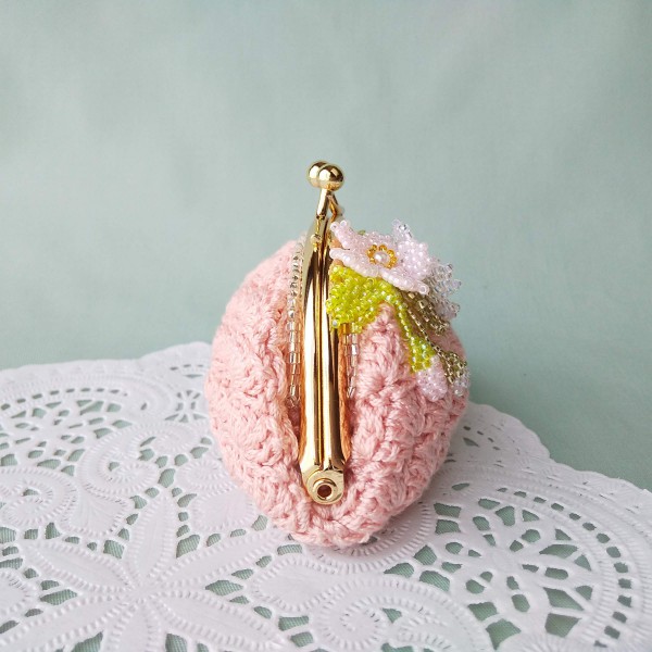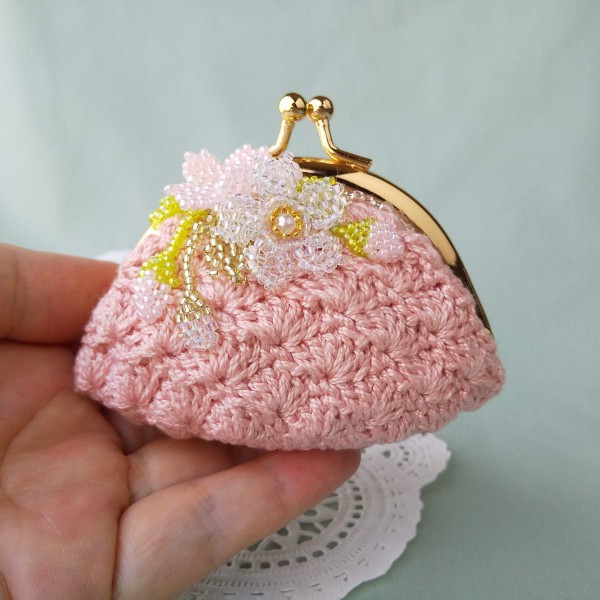 | 底は細編み、側面は扇を広げたような編み地の松編みです。コットンなのでサラサラです。 コットンだけでは寂しかったので、ビーズステッチで作った桜をアレンジしてみました。 ビーズを一粒一粒針に通して、適度な力加減で引き締めながら、桜の中心から作っています。 バッグの中で迷子になりがちな小物を入れたり、 アクセサリーを入れたりすることができる、がま口ポーチです。 手のりサイズなので使いやすい大きさです。 |