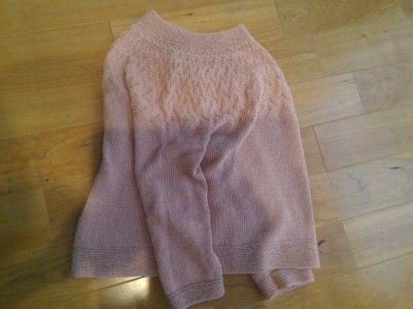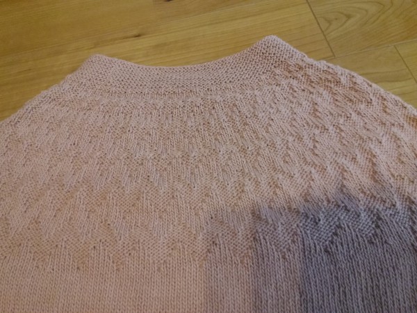 | オーガニックコットンのセーター 「風工房の定番ニット」の裏表紙の作品を参考にしています。袖口を狭くしたり、衿の目数を減らしたりしています。本を見たときから気になっていたパターンで、ウールの季節まで待てず、コットンで編みました。秋に着ようと思います。 |