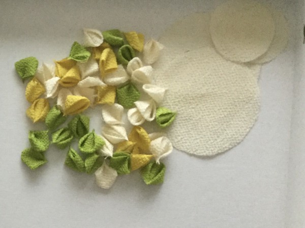 隙間を開けない、花の色のバランスを考える、思ったより花が取れる、など悪戦苦闘しながら楽しく作成中(^^;