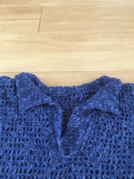 | 毛糸ピエロの編み図、ポロシャツセーターを編みます サイズと糸を変えます 糸はコットンリネンのスラブ糸です 襟や裾は棒針3号で一目ゴム編みにしました |