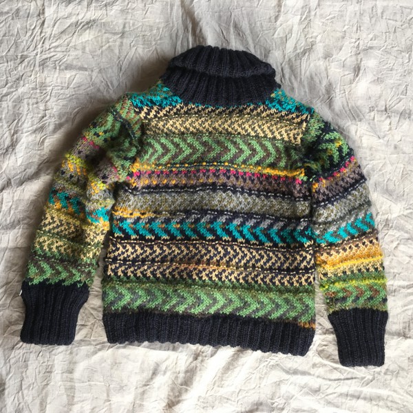 段染めの糸をベースに数種類の色の糸を編みこみ模様で編んだら