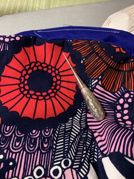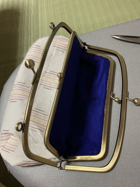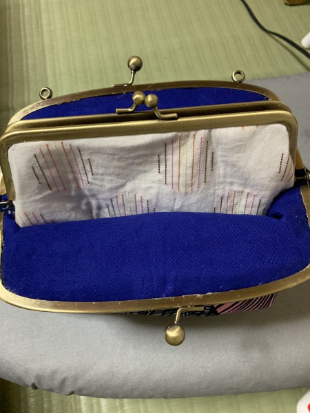 親子がま口です。外側はマリメッコ、内側は家にあった残り布。接着キルト芯を貼ったので少しごわついて金具に入れずらかった。しっかりしているから、厚手不織布の接着芯でも良かったかも!