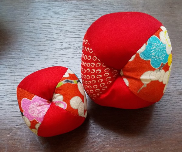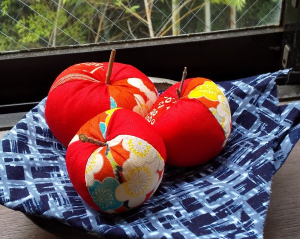 4枚接ぎ合わせ、中央上下に糸を通し窪ませました。茎の小枝は近所で拾ったものです。