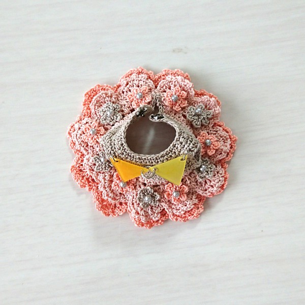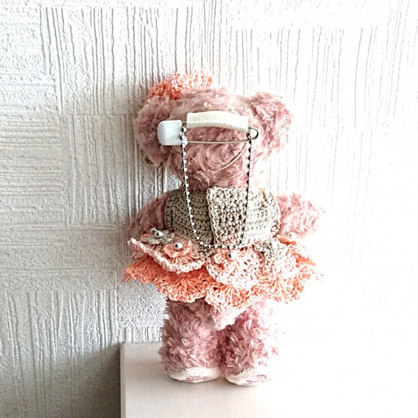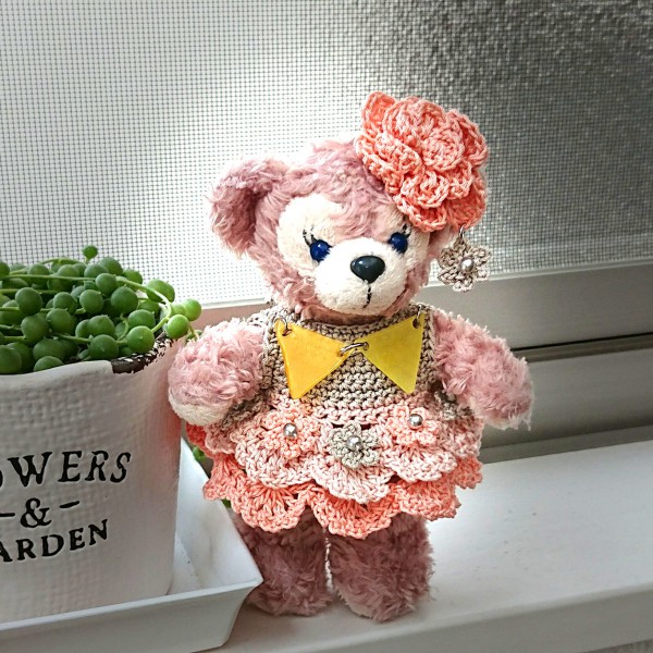| シェリーメイ(ぬいぐるみバッジ)のワンピースです。 裾のスカラップでキュートな雰囲気に。 小花とリボン代わりのプラ板を飾りました。 |