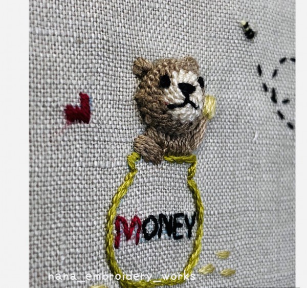 HoneyではなくMoney。という駄洒落でクマの立体刺繍をしました