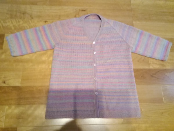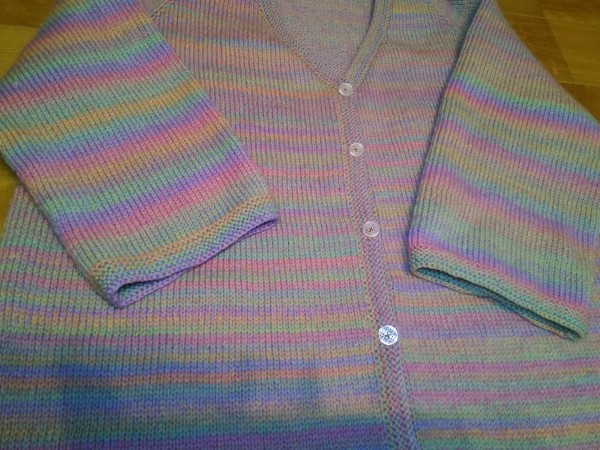 | トップダウンのカーディガンです。 前たてがつれると思ったのですが、アイロンで収まってくれたので編み直ししなくてすみました。家で着る用なので、着丈は長めに、袖丈は肘が隠れるくらいの短めに。ボタンはレースっぽいデザインでピンク色のかわいいボタンを使いました。 |
