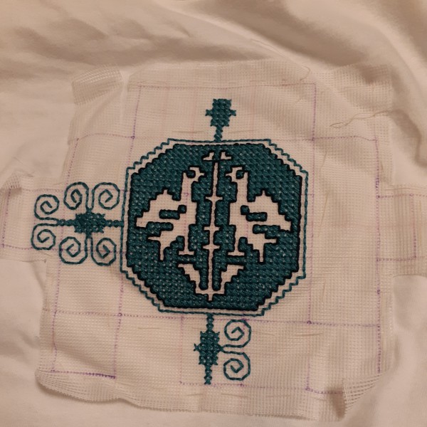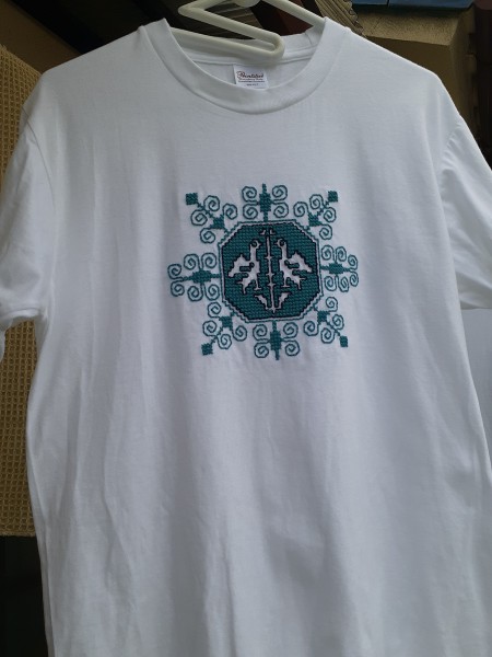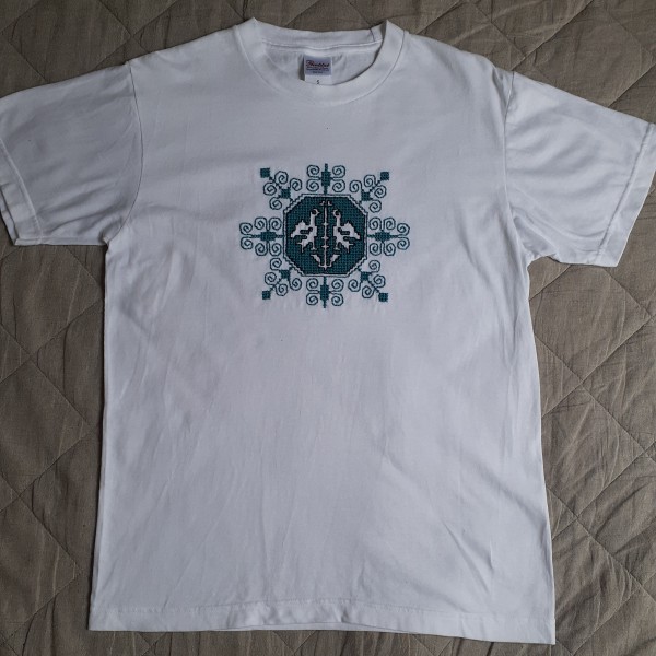 アッシジ刺繍Tシャツにしてみました!抜きクロスで、メリヤスにも綺麗にクロスステッチできました。鳥のモチーフがお気に入りです