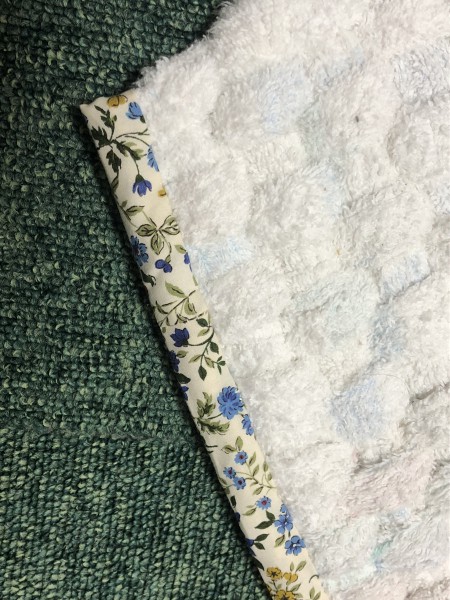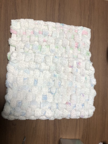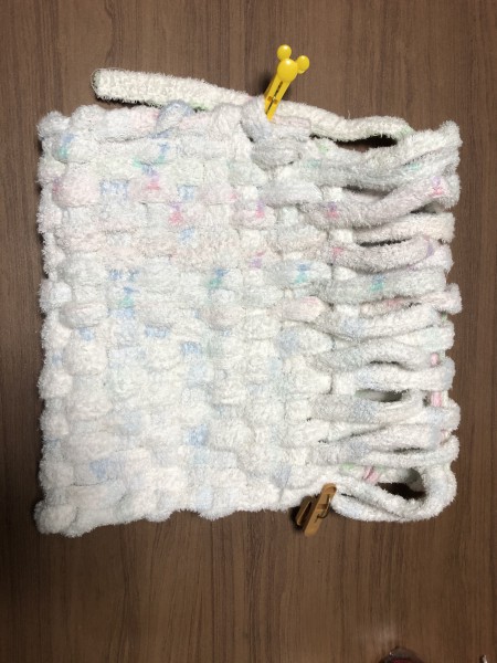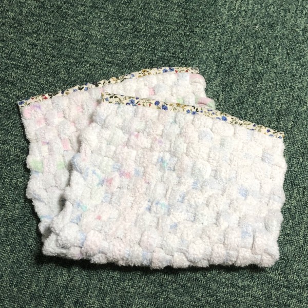 | 使い古しのタオルを織ります。まずは細く切って四つ折りにして縫う。紐状になったら、空き缶(鳩サブレ)にぐるぐる巻きつけて、織っていきます。バスタオル4枚程度準備してますのであるだけ編みます。端はバイヤスで包んで、マットができる予定。パステル調のタオルを集めたので、ふんわり仕上がると思う。 | |